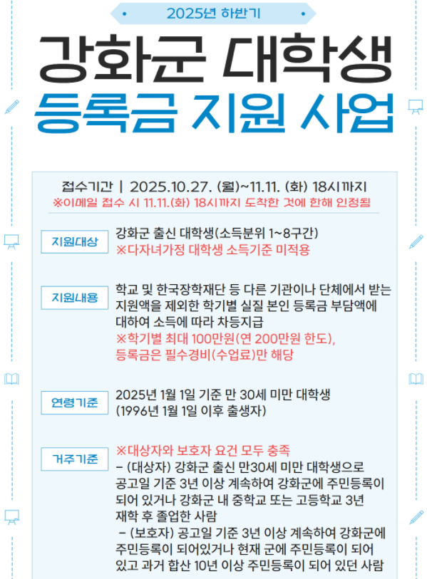 [교외장학] 2025년 하반기 강화군 대학생 등록금 지원 사업 안내